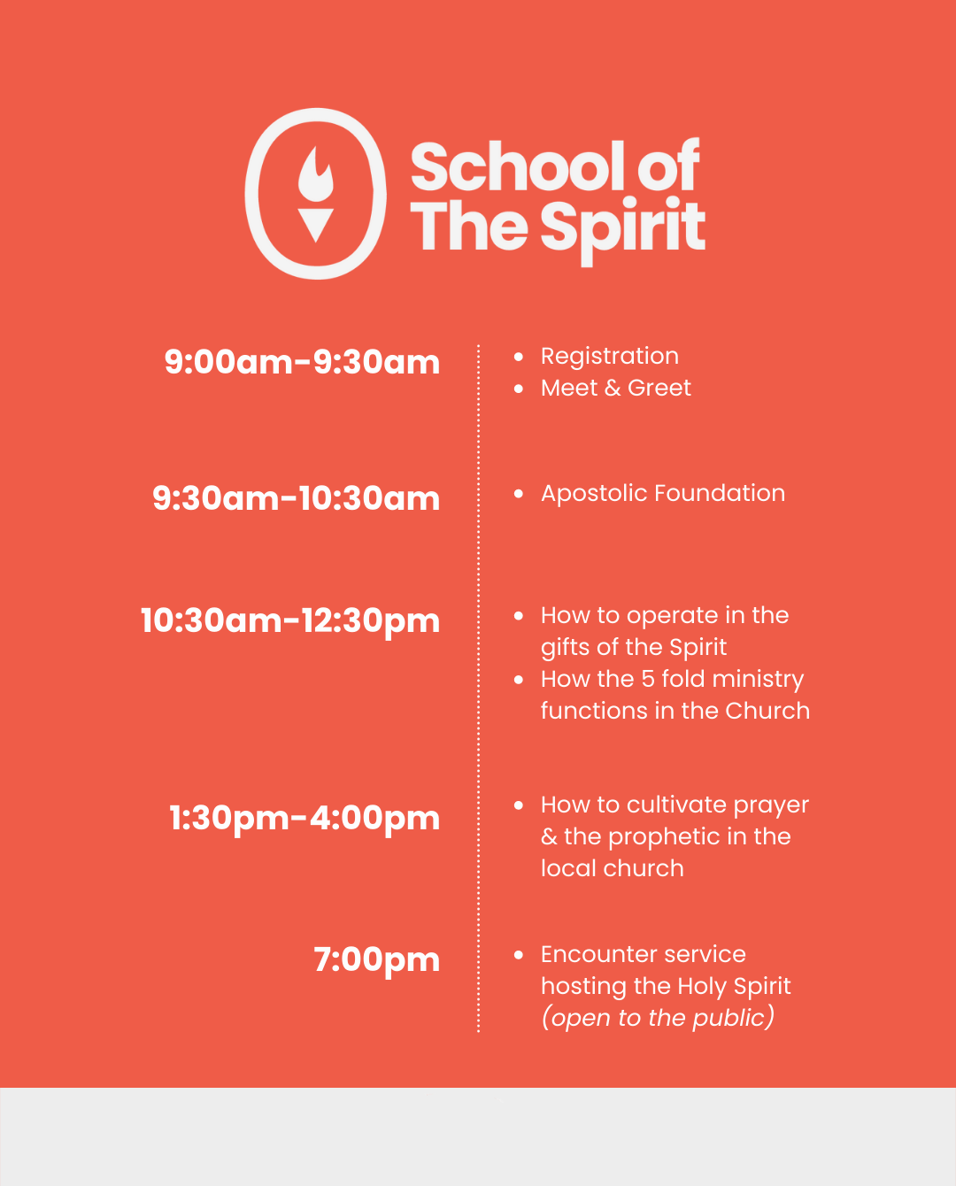 Join us for this powerful one-day School of the Spirit intensive designed for pastors, church leaders, ministry teams, and believers hungry for a deeper move of God. This transformational day will equip you to minister in the power of the Holy Spirit and grow in spiritual effectiveness.
