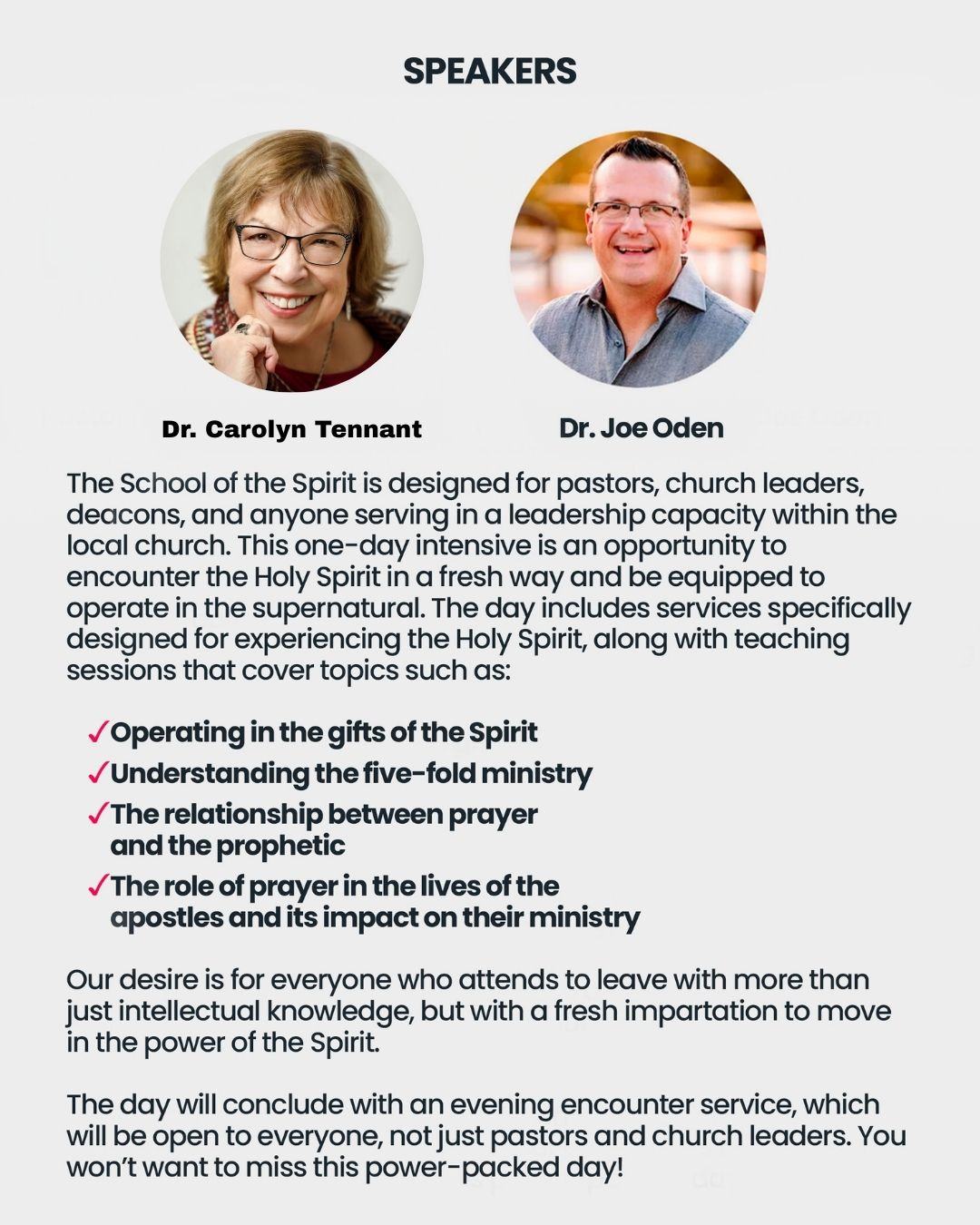 Our guest speakers, Dr. Carolyn Tennant and Dr. Joe Oden, will lead dynamic teaching sessions, along with Holy Spirit-focused services and ministry times throughout the day. Together, we will pursue a fresh encounter with God and receive practical training for supernatural ministry.
